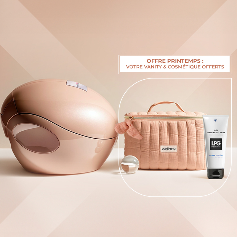 * Offre valable du 16 mars au 26 avril 2026 pour tout achat d'un appareil Wellbox® 2 édition Nude sur le site web, offre composée d'un Gel Lipo-Réducteur et d'un vanity de voyage Wellbox®. Valeur totale : 83€ ttc.